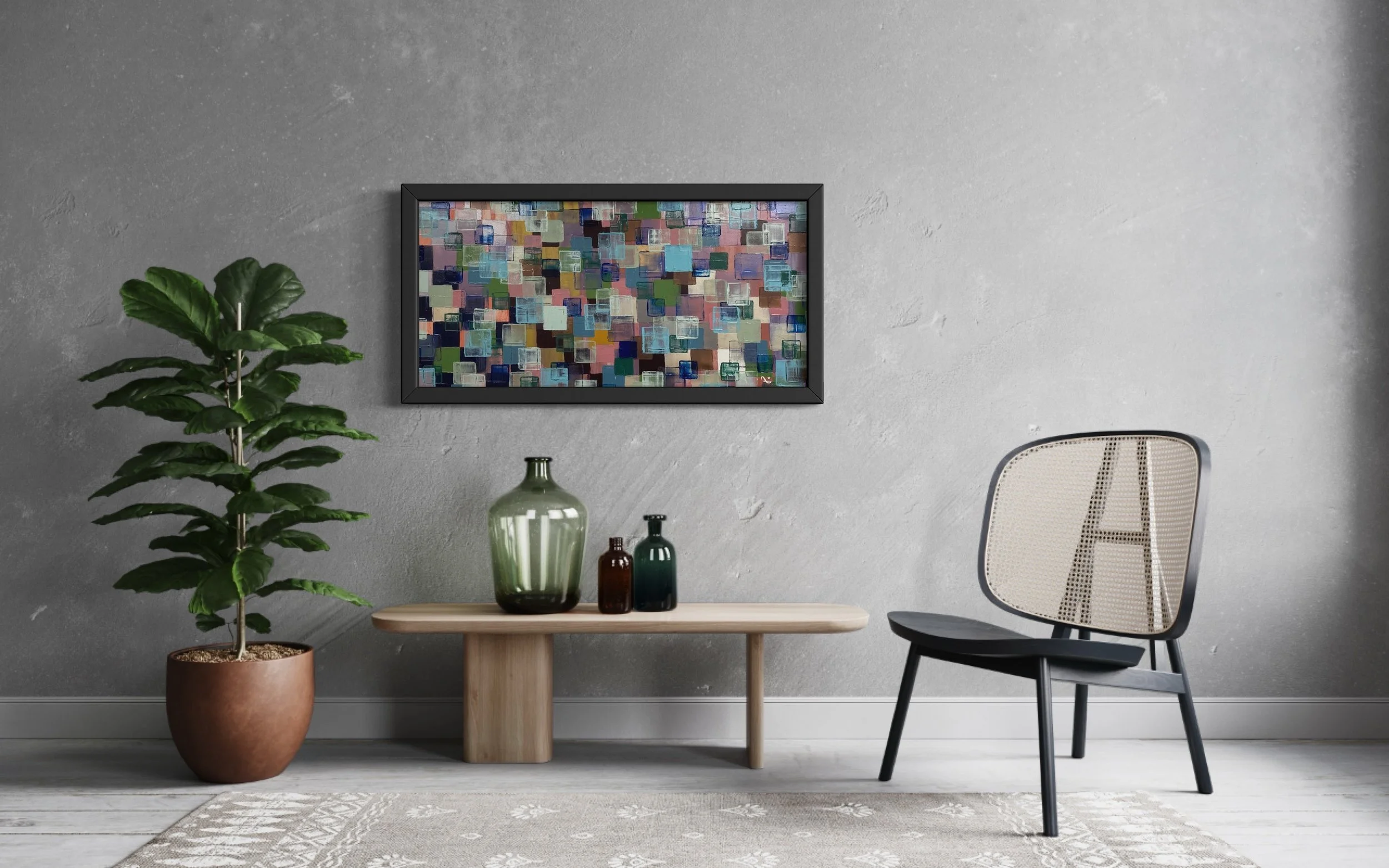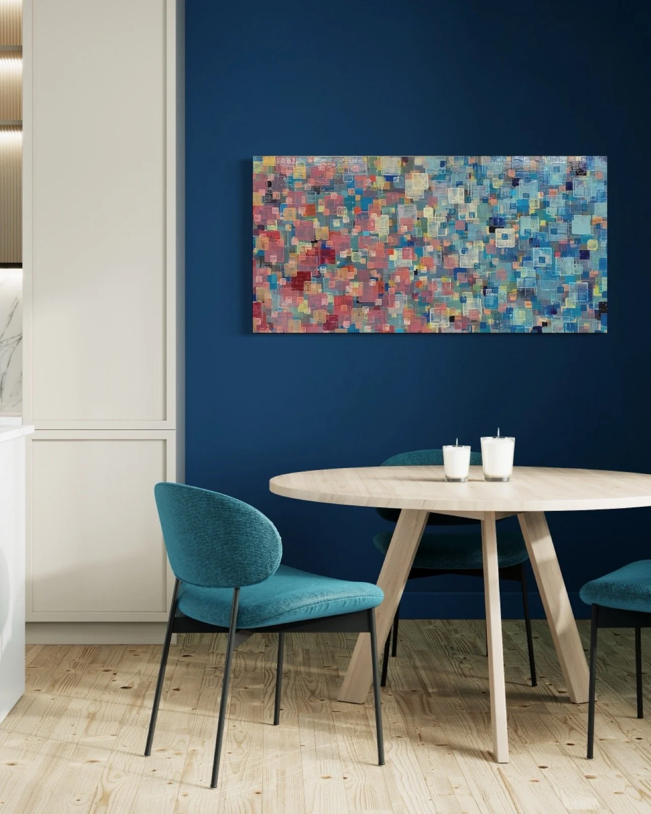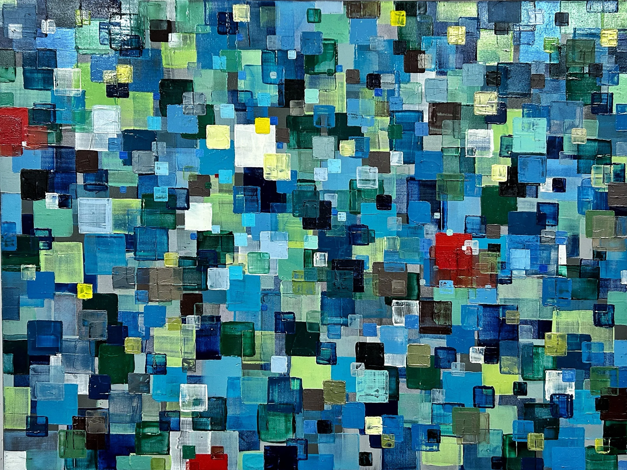 C’est une recherche picturale faite dans l’esprit de l’automatisme, s’inspirant du pixel art. De façon aléatoire, je dépose des carrés sur ma surface jusqu’à ce qu’un sujet se présente à moi.