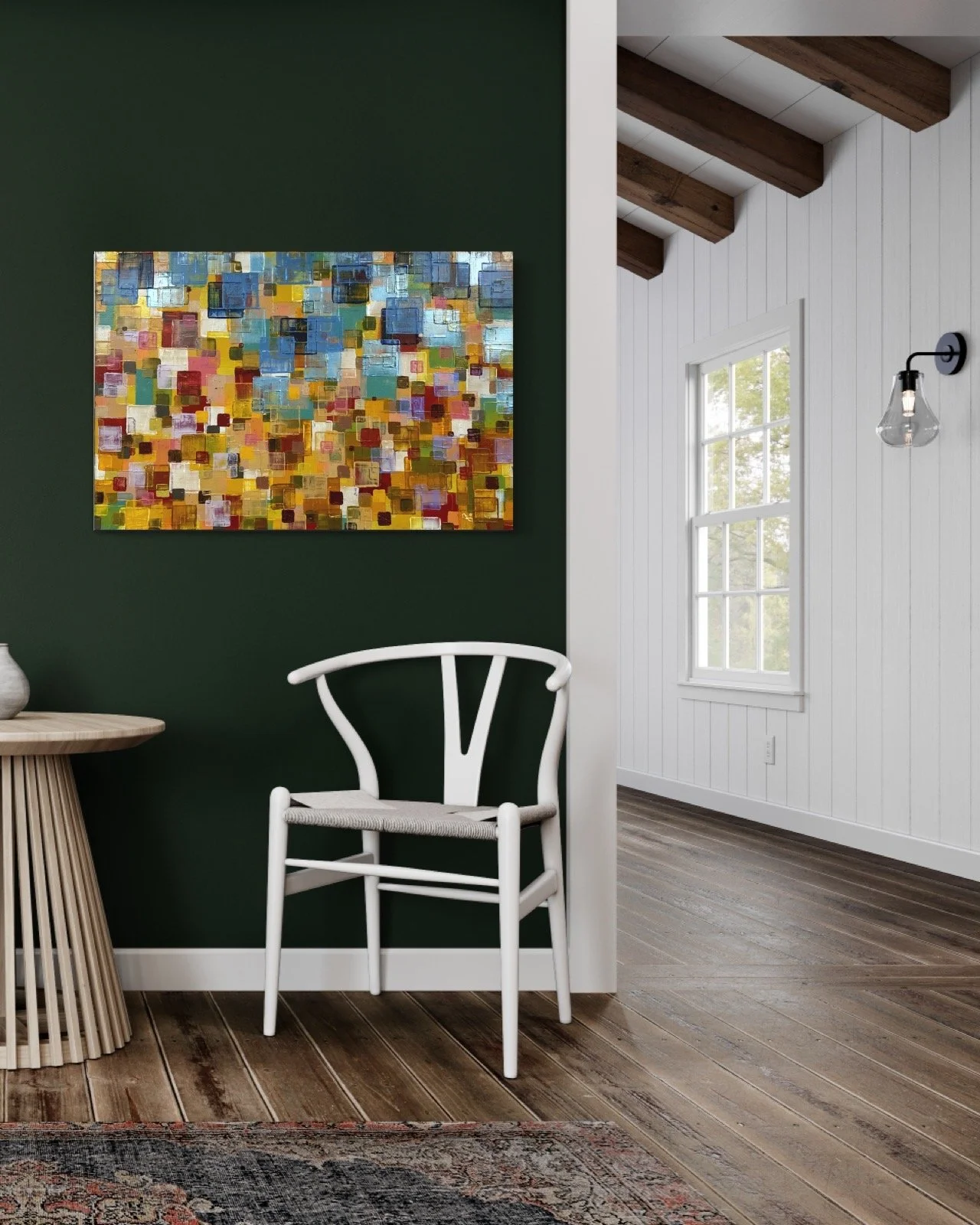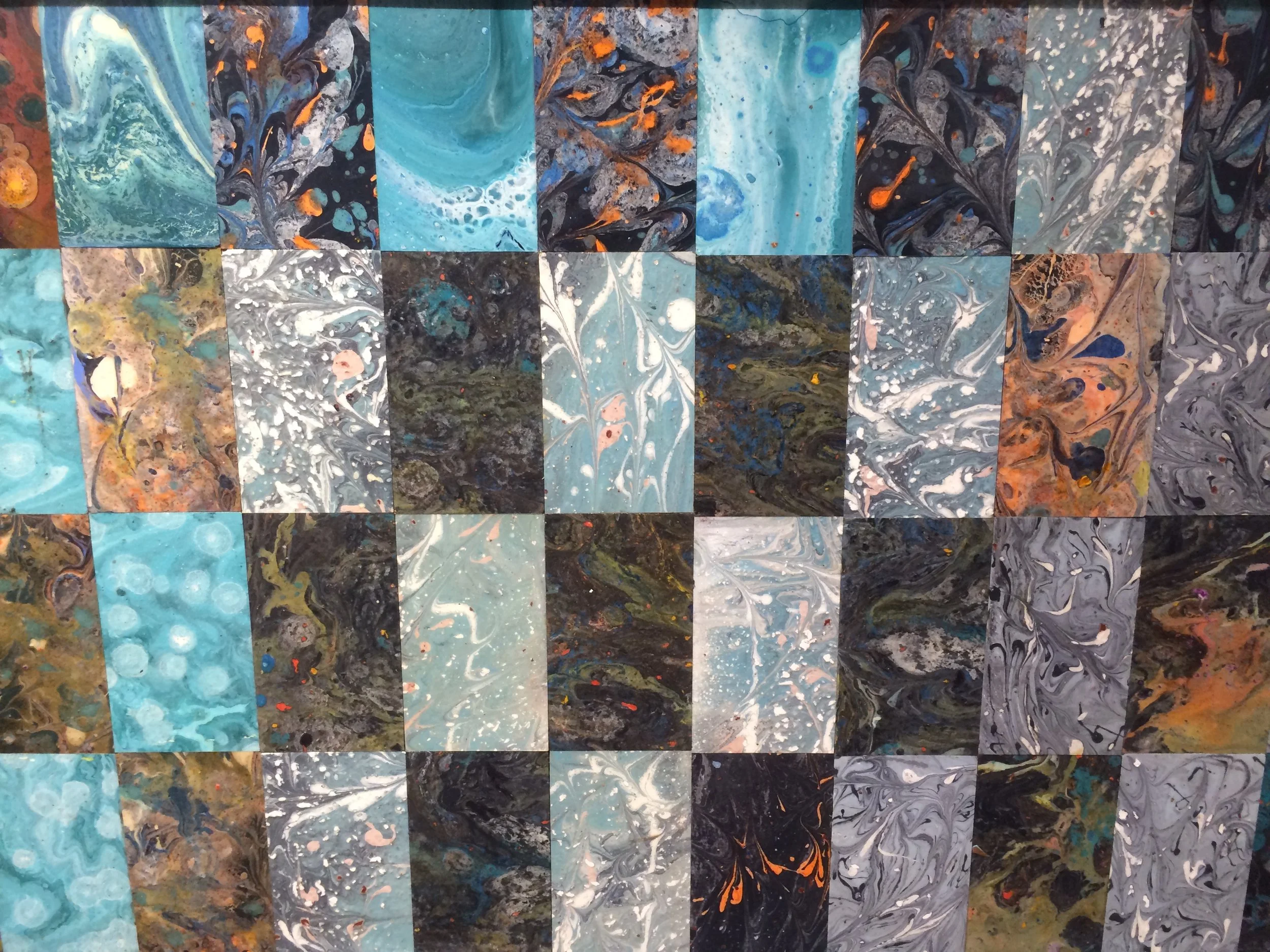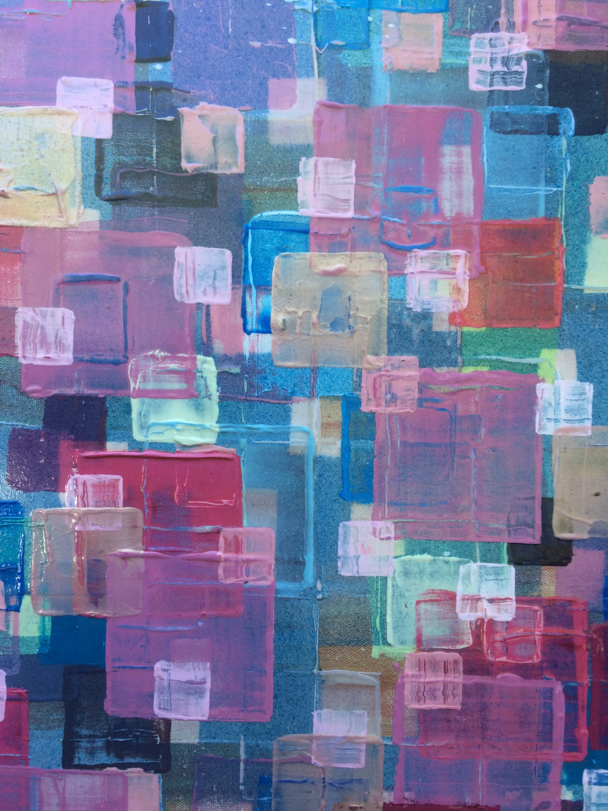 De là, j’introduis des carrés en transparence pour affiner ma pensée du sujet. (parfois avec des pigments mica)