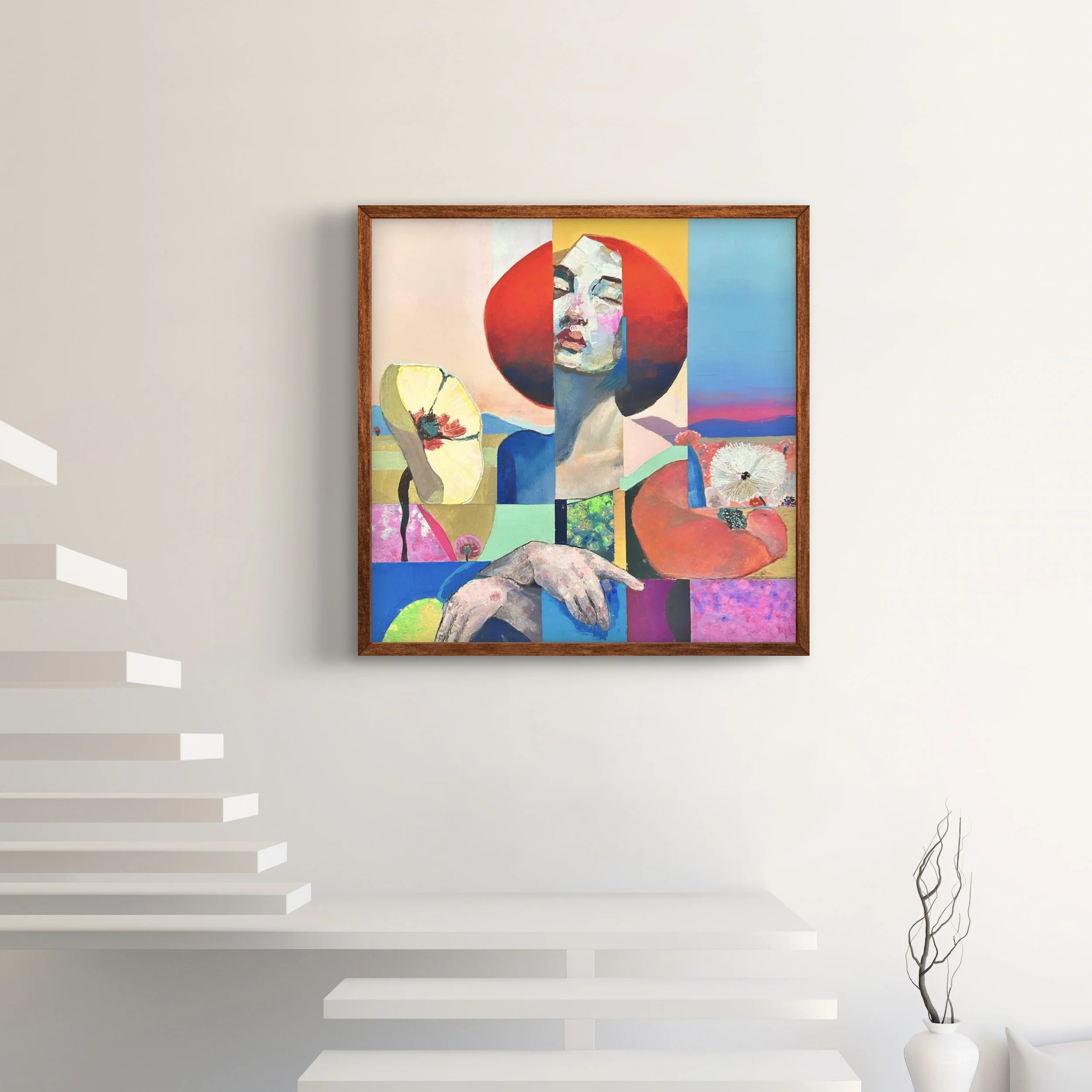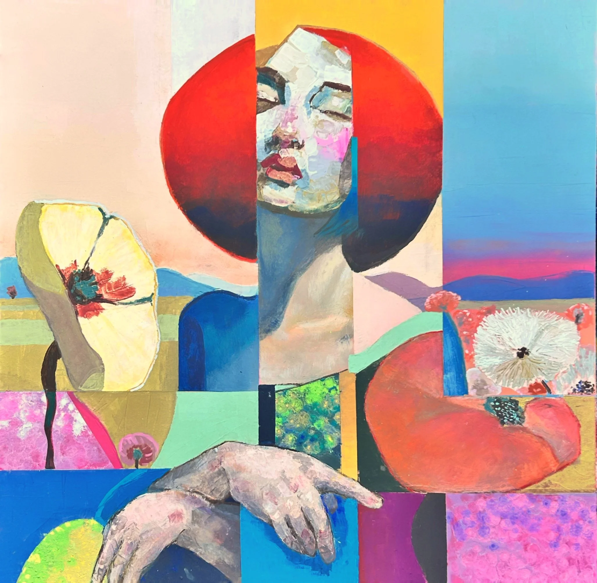 Dans cette œuvre, j’ai voulu traduire visuellement le poids invisible que trop de femmes portent au quotidien. Une tension intérieure entre la pression d’exister, de plaire, de performer… et le désir profond de paix, de légèreté, de liberté. La figure centrale lutte pour s’éloigner du tumulte. La fleur éclatante à gauche — bruyante, presque arrogante — incarne l’apparence qu’on exige, l’image qu’on attend. Tandis que le coquelicot à droite, fragile et vibrant, devient le symbole d’un rêve doux et simple : enfiler une robe qu’on aime, marcher dans un champ en silence, sentir le soleil sur la peau… sans justification. Les fleurs ne suffisent pas à apaiser cette charge. Elles offrent un contraste, un rappel, un souffle… mais la tension reste palpable. Et pourtant, dans ce désordre coloré, il y a aussi une volonté de beauté, une main tendue vers quelque chose de plus léger.
